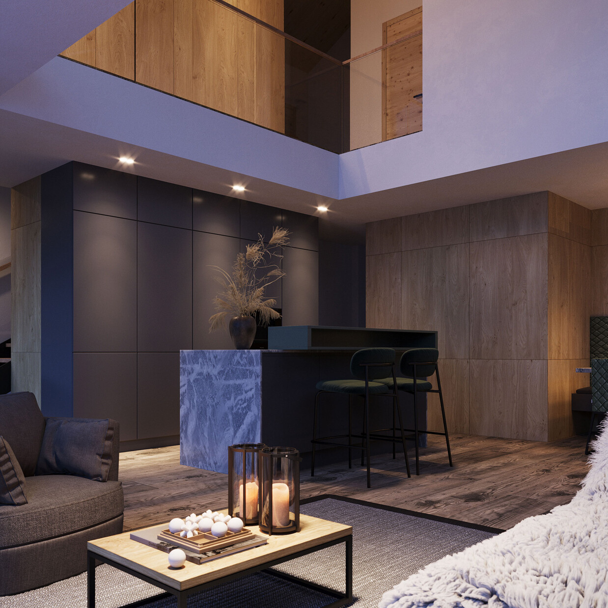 De ruime living met een kookeiland, eethoek en de gezellige zithoek bieden optimaal wooncomfort. Vanaf de living is door de grote glasfaçade het ruime terras te bereiken waar zich een tweede eettafel bevindt en het verwarmde bad. De adembenemende vergezichten op de skipiste of het sprookjesachtige Berwang maken de ervaring compleet.