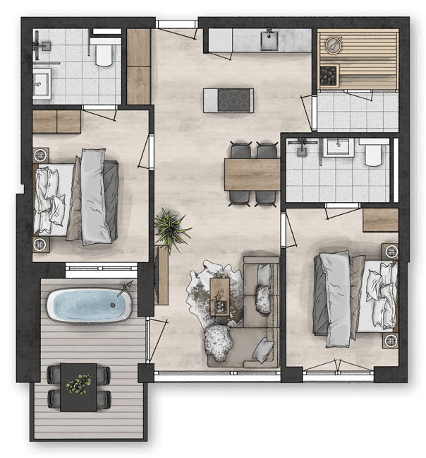 Deze luxe 4-persoons appartementen zijn ruim opgezet en variëren in vloeroppervlakte ca. 64 tot 68 m². Elk appartement beschikt over twee ruime slaapkamers en twee luxe badkamers welke zijn voorzien van een regendouche, toilet en wastafel. De complete inhouse wellness faciliteiten met de Finse Premium sauna en het verwarmde bad op het terras maken het vakantiegevoel compleet.