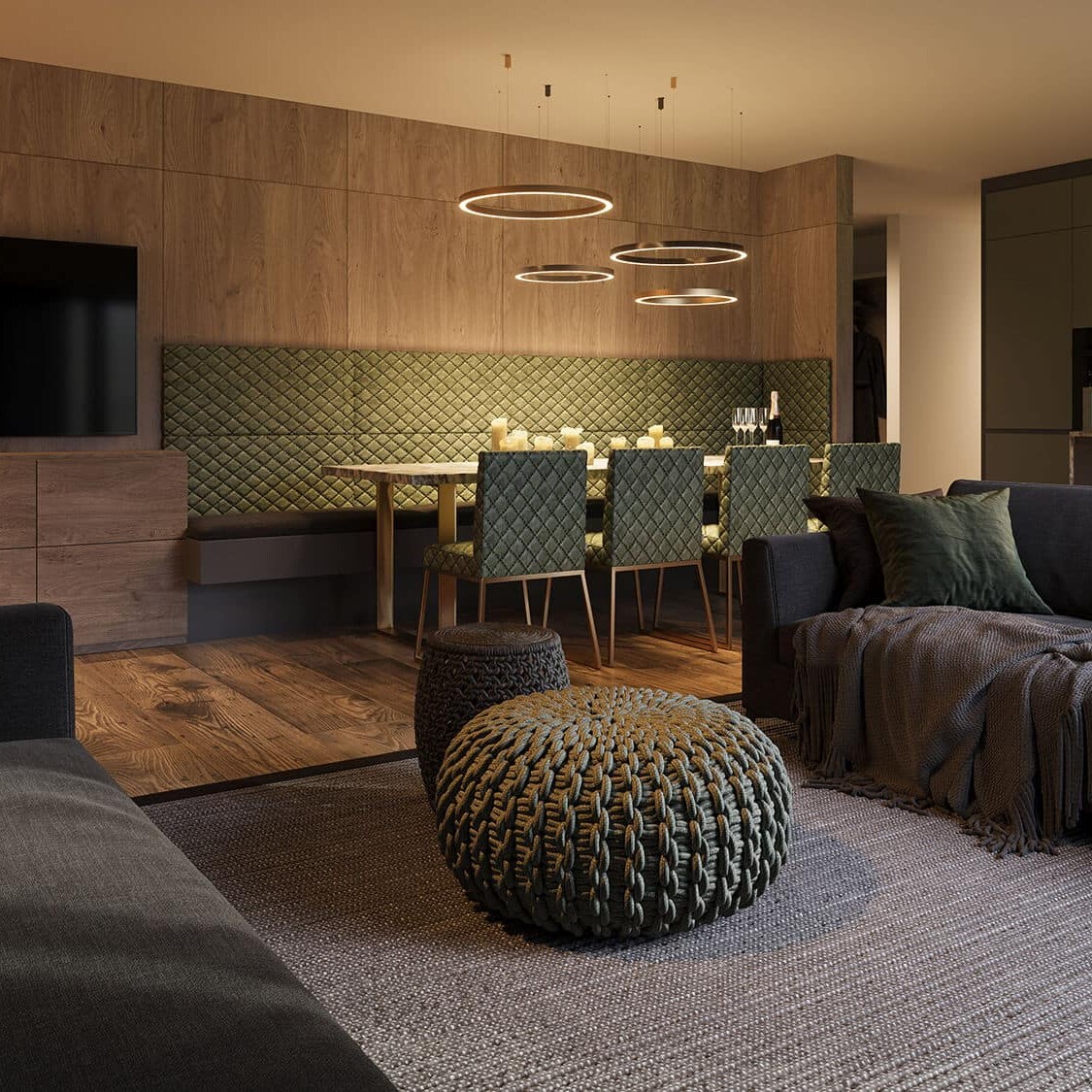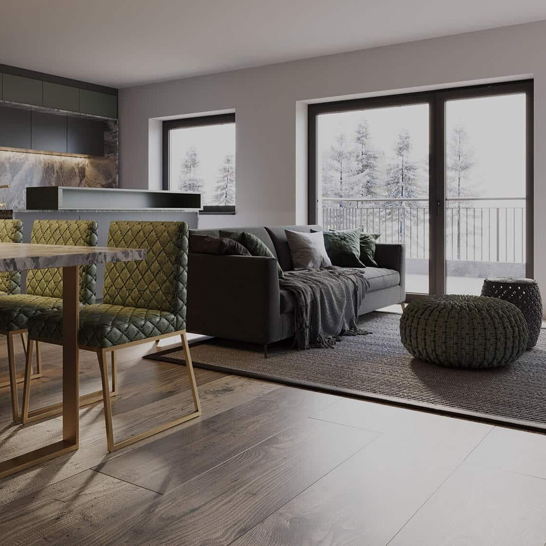 Op de onderste woonlaag bevindt zich bij binnenkomst de garderobe met een separaat toilet. In de gezellige en ruime living is een luxe woonkeuken met kookeiland, de eettafel, een separaat toilet en de gezellige zithoek, waar het heerlijk na kletsen is na een dagje actief zijn op de berg. Centraal in de woonkamer is een opening gemaakt zodat je tot de nok van het gebouw kunt kijken, wat een enorm ruimtelijk gevoel geeft. Aangrenzend aan de woonkamer bevind zich een familie slaapkamer met een twee persoons bed en een stapelbed. De ruime badkamer en suite is uitgerust met een douche, toilet en een wasbak.