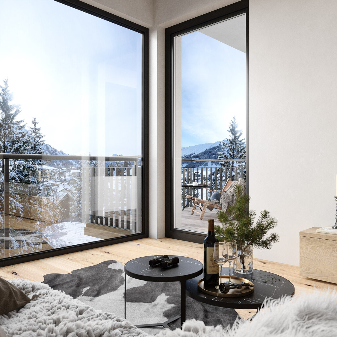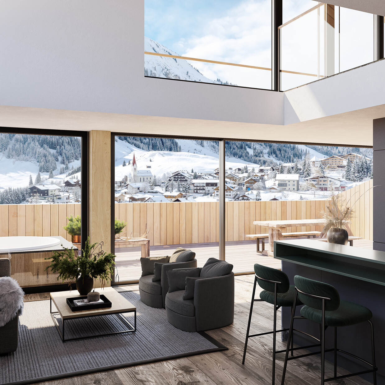 Vanaf de living is door de grote glasfaçade het ruime terras te bereiken waar zich een tweede eettafel en het verwarmde bad bevinden. Het ruime terras op het zuiden en de adembenemende vergezichten maken de ervaring compleet.